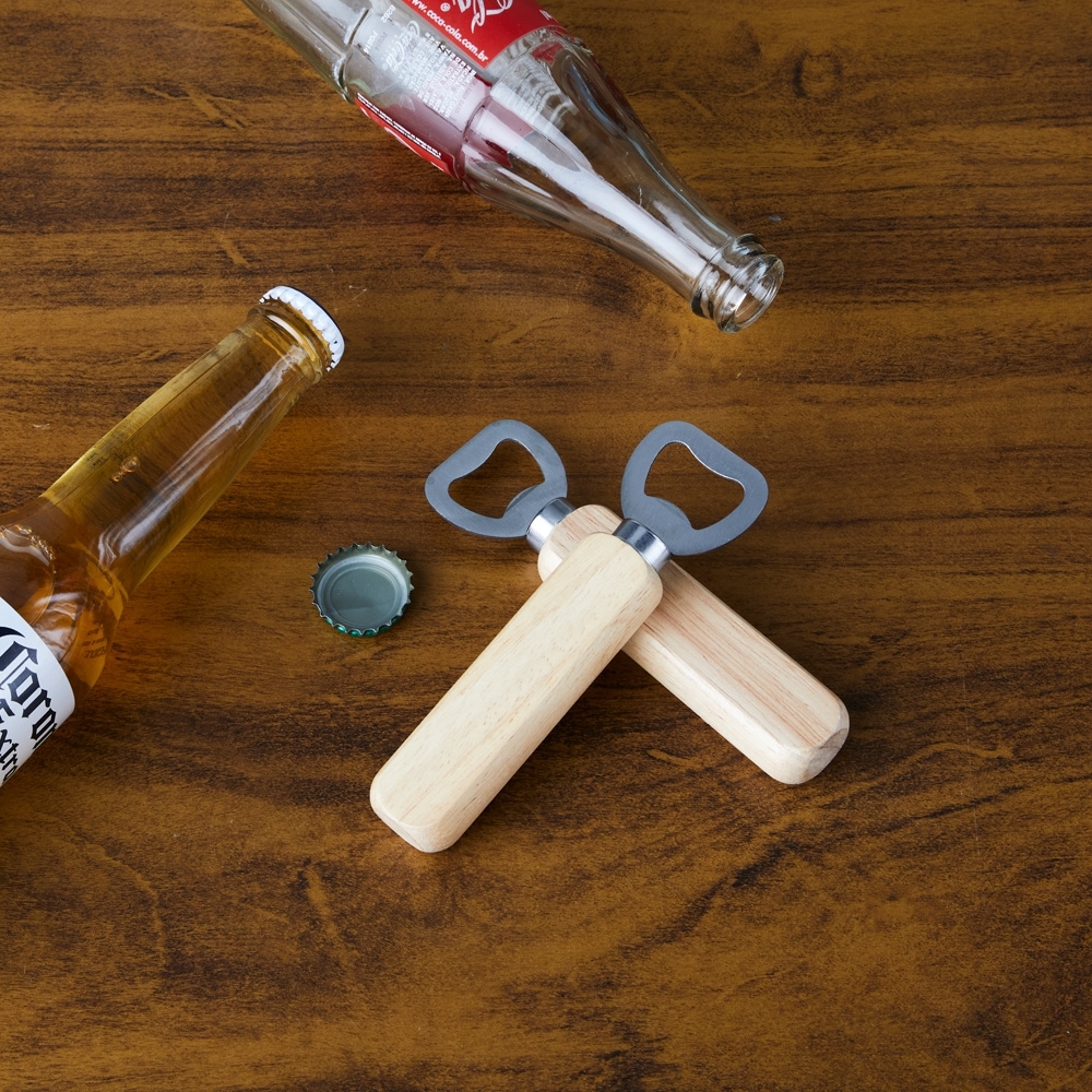 Abridor metálico com cabo de madeira.