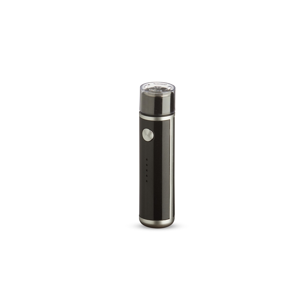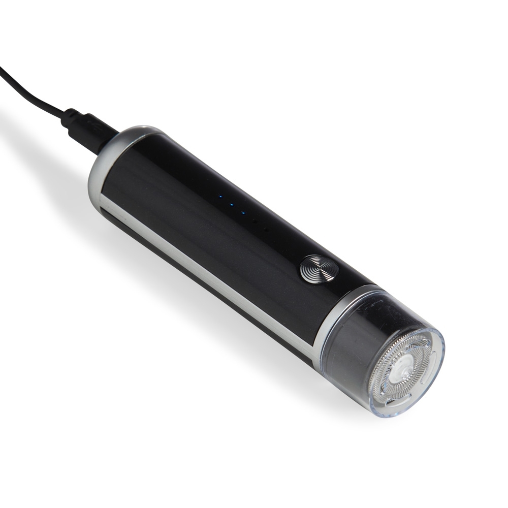 Aparador de barba elétrico recarregável. Possui status da bateria visível e botão antiderrapante para uma maior aderência ao toque. Acompanha cabo USB Tipo-C, escovinha para limpeza e tampa protetora.