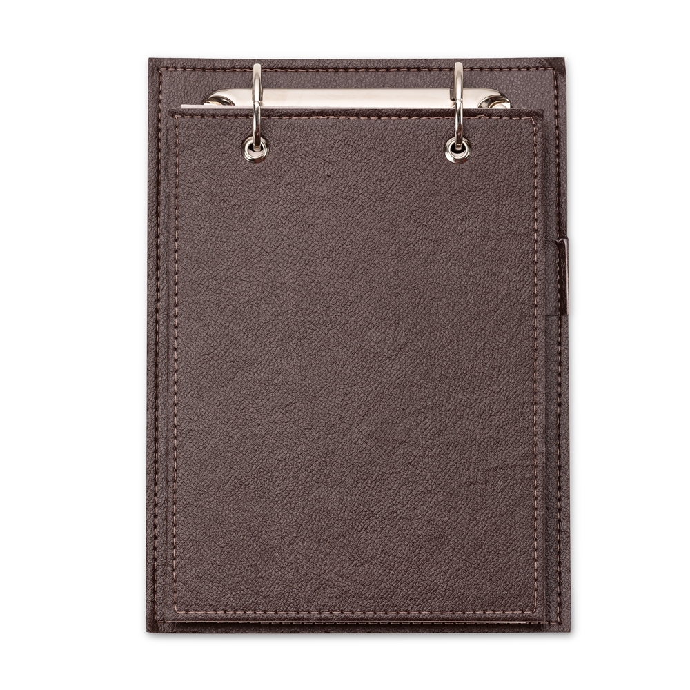 Bloco de anotações de mesa com trilho de ferro, capa em couro sintético. Possui suporte na lateral interna para colocar caneta (não acompanha) e aproximadamente 96 folhas recicladas com área destacável.