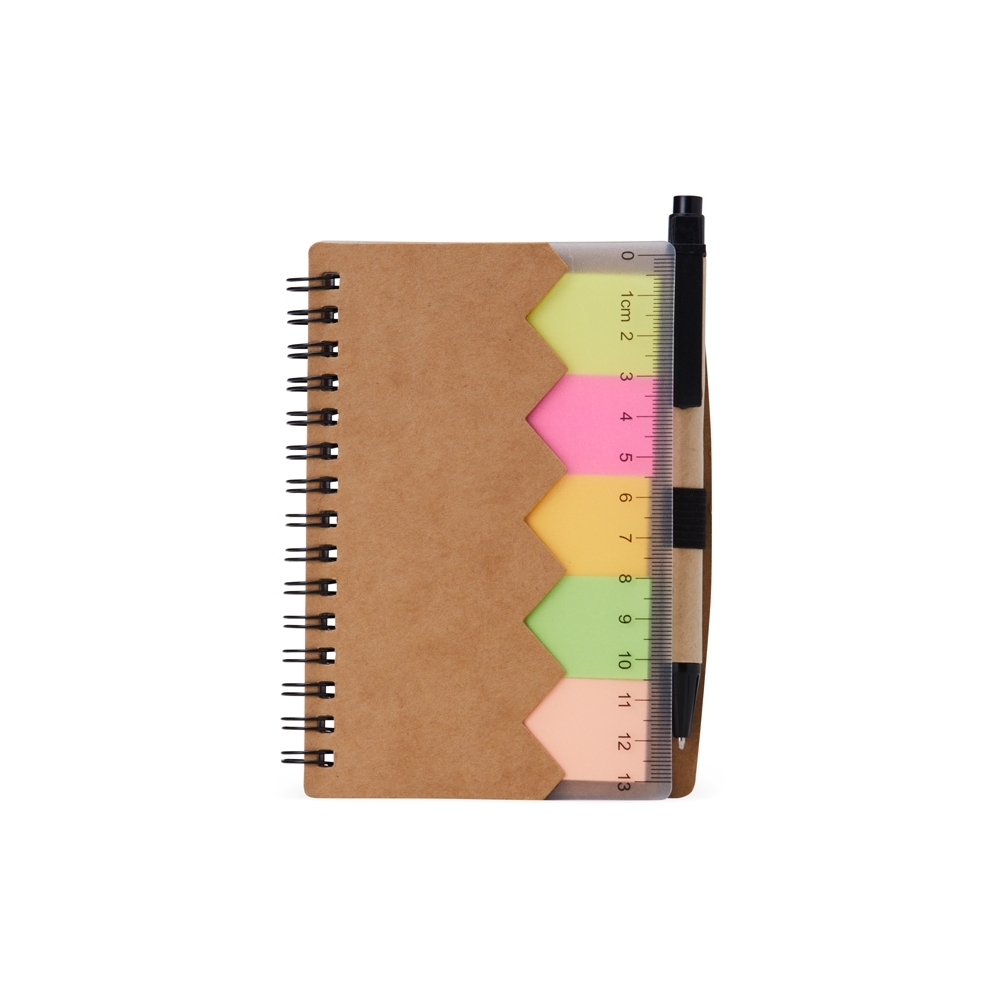 Bloco de anotações ecológico com autoadesivos, régua e caneta, feito em kraft. Contém folha com régua 13 cm, cinco autoadesivos com aproximadamente 13 folhas, bloco com aproximadamente 69 folhas brancas com pauta, porta caneta elástico e acompanha caneta de papelão com detalhes plásticos, carga esferográfica azul 1.0mm e acionamento por clique.