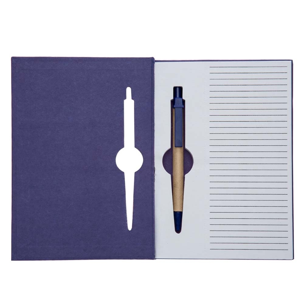 Bloco de anotações ecológico com capa e miolo vazados, utilizados como suporte para a caneta. Bloco com miolo de picote, elástico para lacre e caneta de papelão com detalhes plásticos, carga esferográfica na cor azul e acionamento por clique.