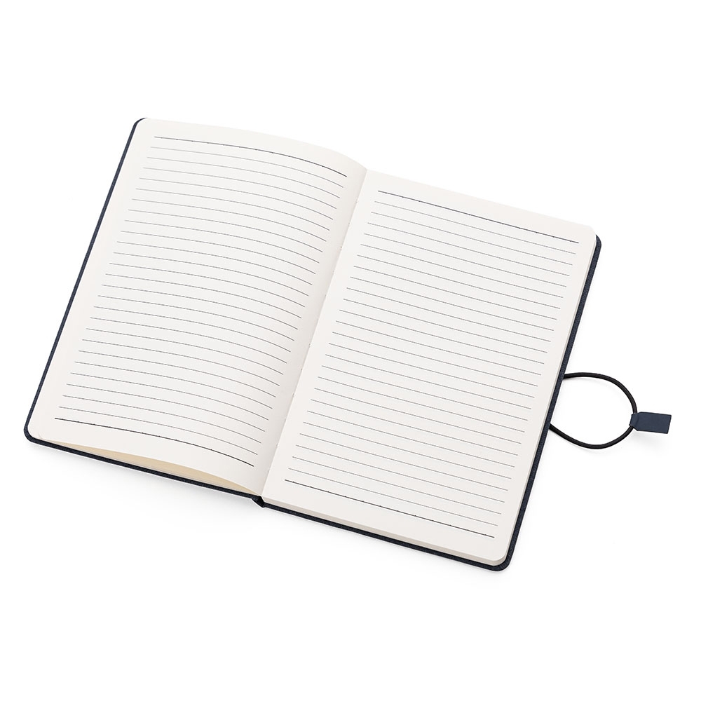 Bloco de anotações com capa dura em tecido de poliéster. Miolo com 80 folhas pautadas na cor bege. Possui elástico lateral com detalhe em couro sintético para fechamento do caderno.
