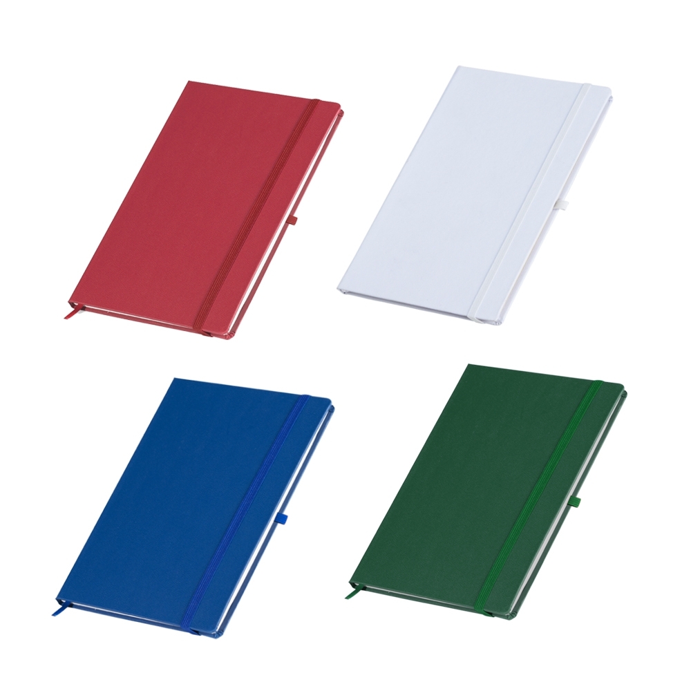 Caderneta em couro sintético com marcador de página em cetim e fita elástica para fechar. Contém aproximadamente 80 folhas sem pauta.