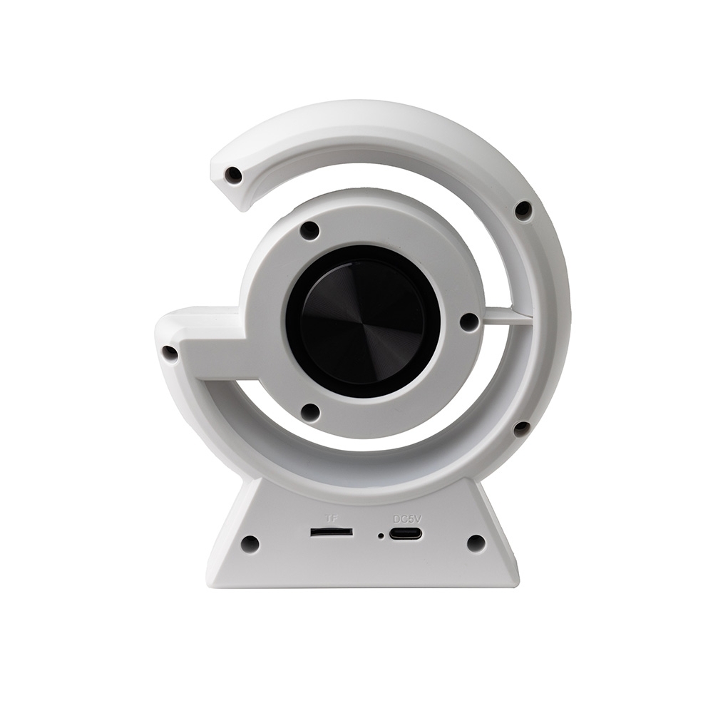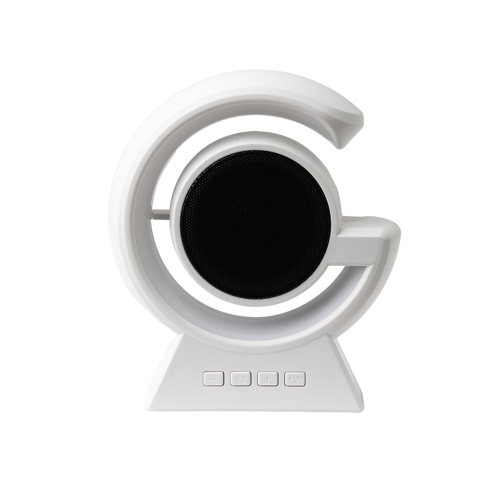 Caixa de som com luminária. Possui 8 modos de iluminação, opera nos modos bluetooth, rádio FM e TF (cartão MicroSD).