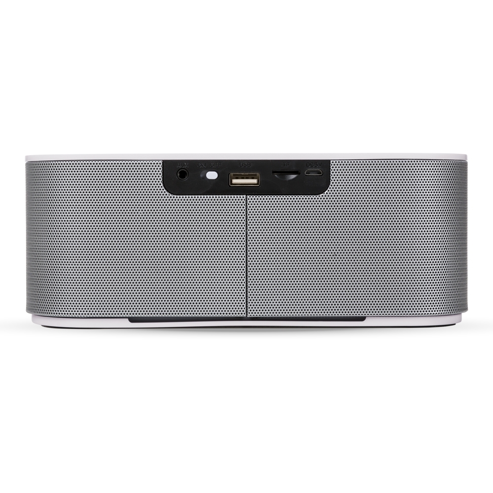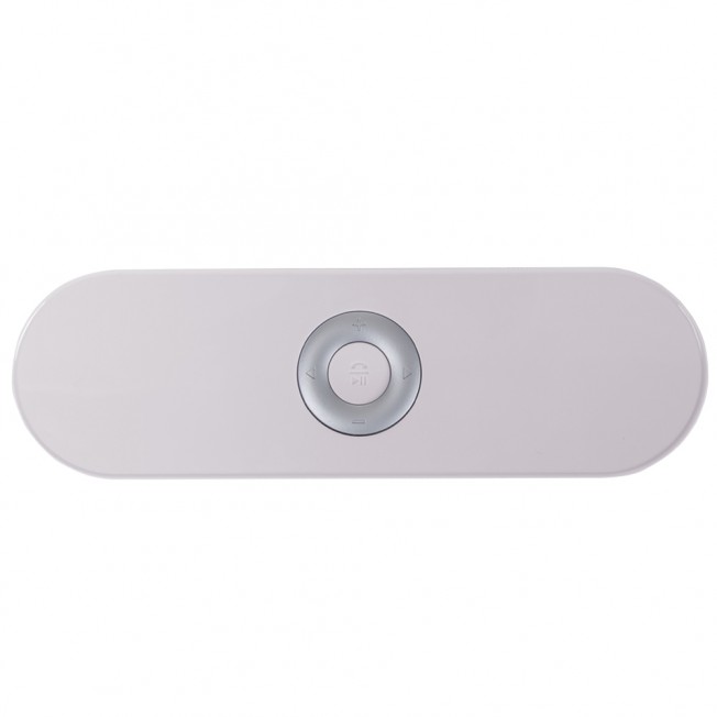 Caixa de Som Multimídia. Design fino e material plástico resistente, possui: botão On/Off no verso, botão >|| (MODE), botão < retroceder faixa ou diminuir volume, botão > avançar faixa ou aumentar volume, botão PLAY/PAUSE e atender chamadas, entrada P2/auxiliar(caixinha de som pode ser conectada no computador, basta segurar o botão central para alternar o modo), entrada microUSB, microfone, entrada microSD(cartão de memória) e entrada USB(leitura de pen drive), parte inferior possui borrachas anti deslizantes e auto-falantes laterais. Acompanha cabo USB.