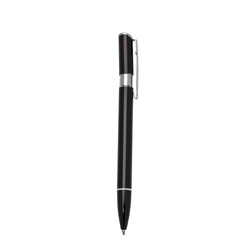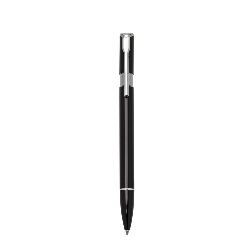 Caneta alumínio, carga esferográfica azul e acionamento por clique.