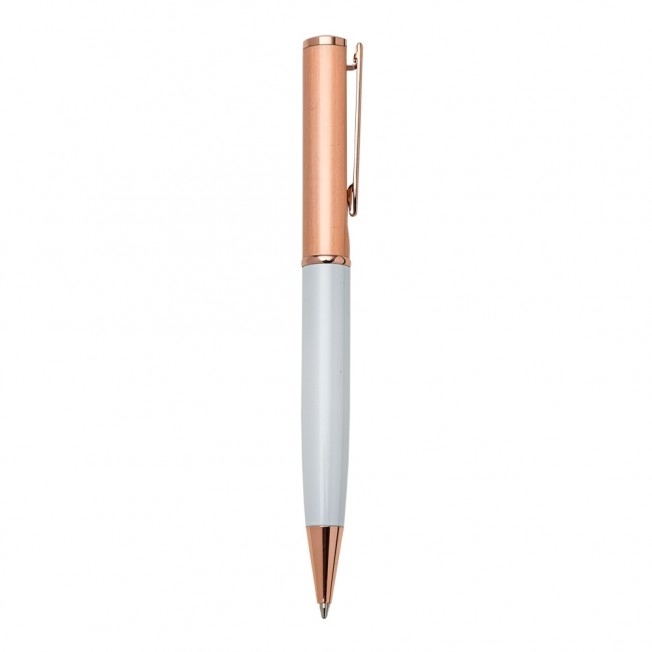 Caneta metal cobre com detalhe inferior colorido. Clip metal com e detalhe circular na ponta superior, possui anel central e aciona por giro. OBS.: PEDIDO APENAS MÚLTIPLO DE 50 PEÇAS!
