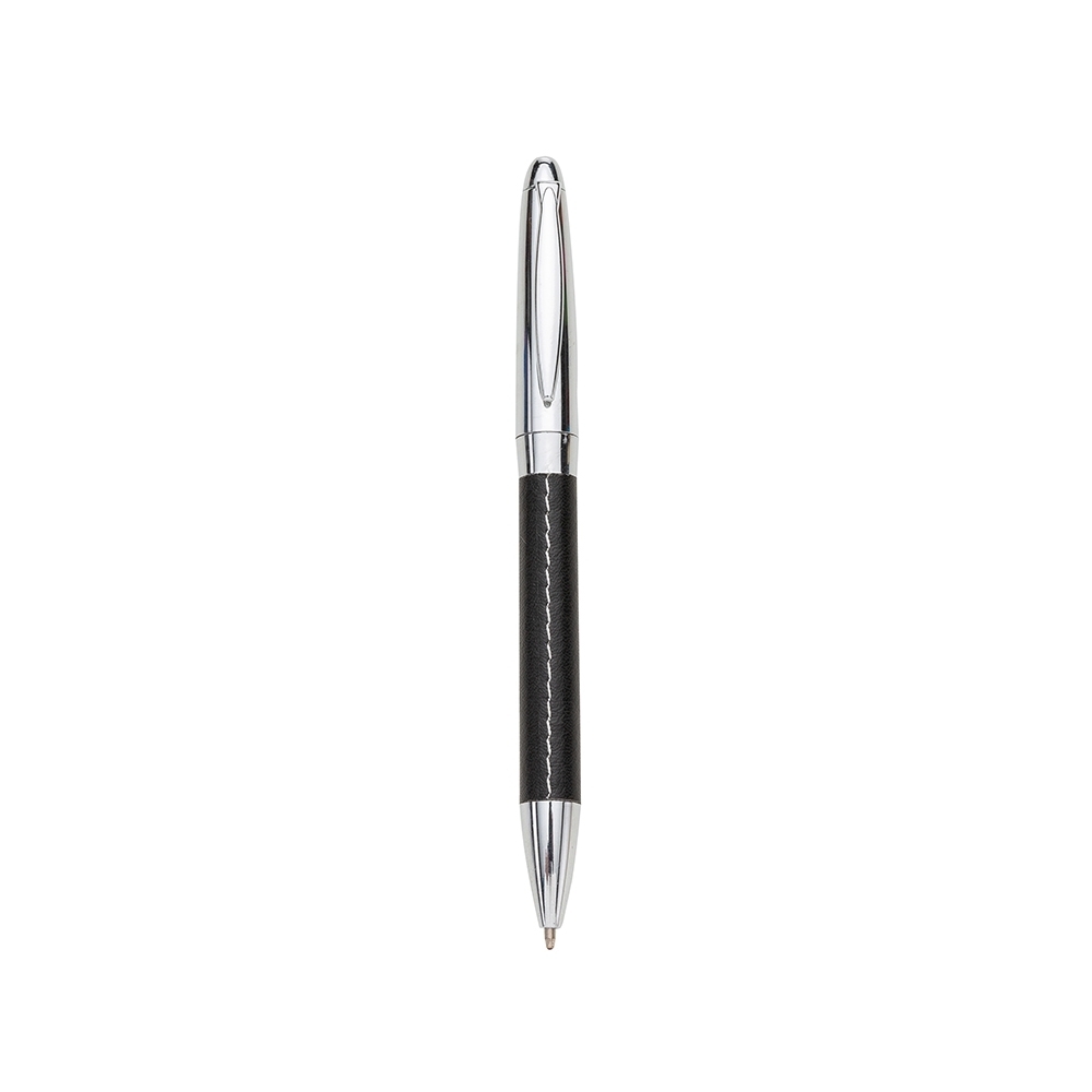 Caneta metálica com detalhe em couro sintético. Carga esferográfica azul e acionamento por rotação.
