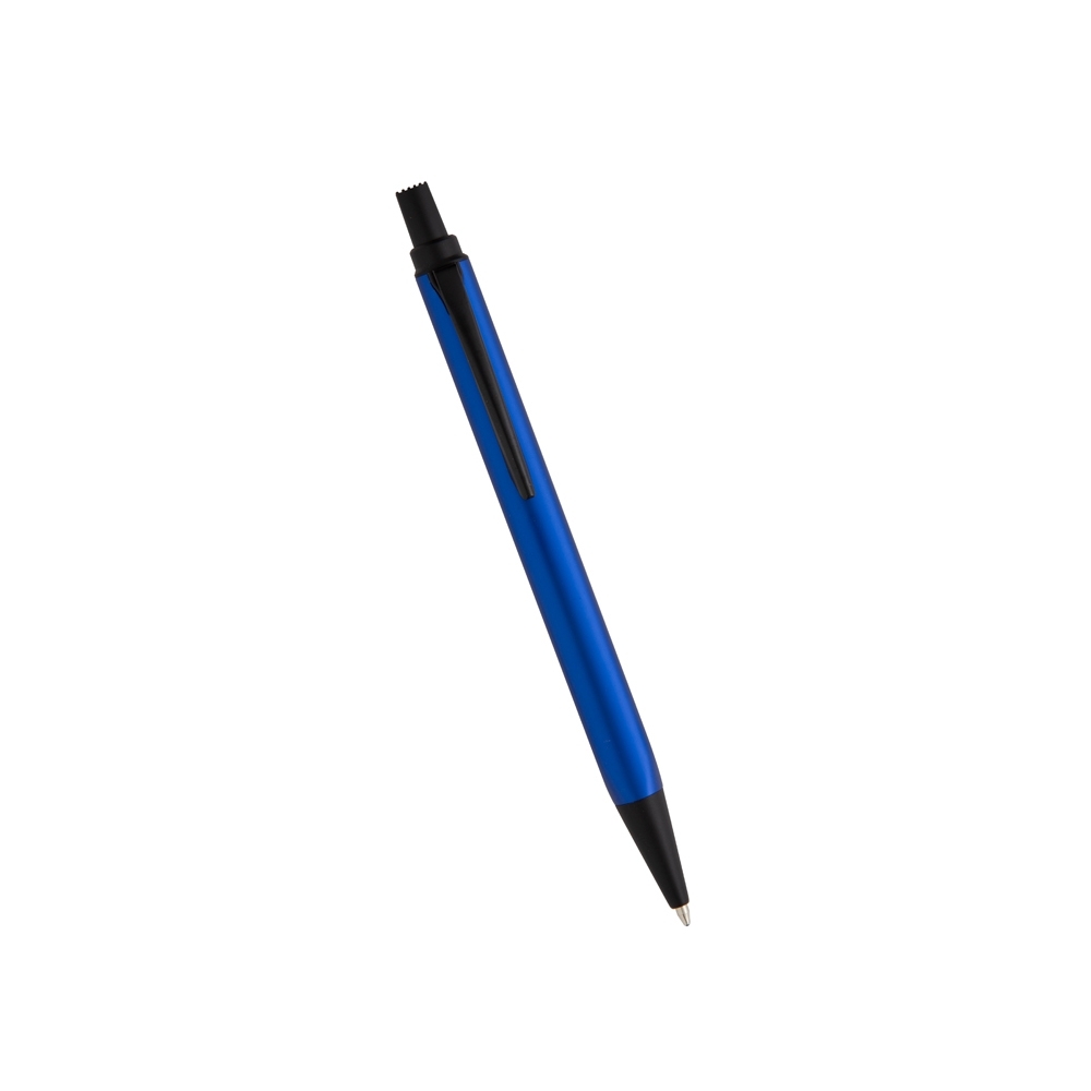 Caneta metálica triangular com carga esferográfica azul e acionamento por clique.