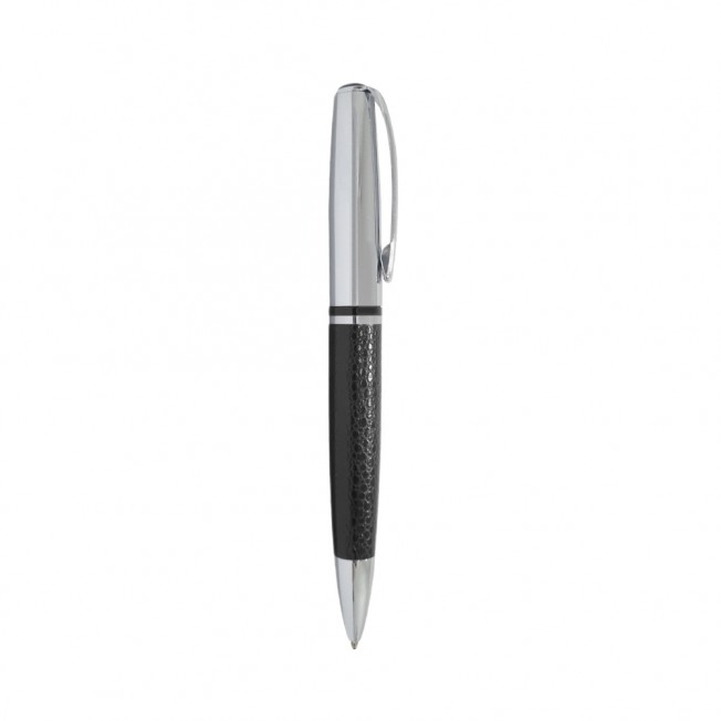 Descrição: Caneta metálica com detalhe em couro sintético, carga esferográfica azul e acionamento por rotação.