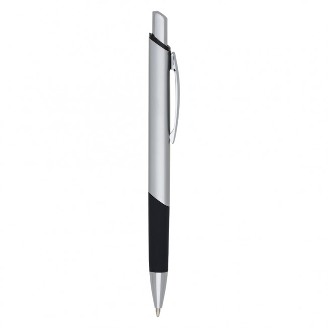 Caneta metálica com design quadrangular, acabamento brilhante (exceto a prata) e detalhe emborrachado, carga esferográfica azul e acionamento por clique.