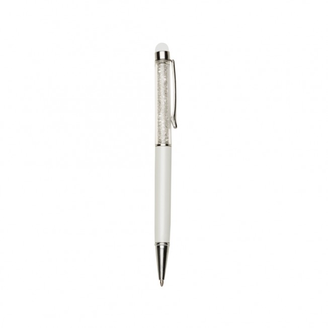 Caneta metálica com touch screen e detalhes em cristal, carga esferográfica azul e acionamento por rotação.