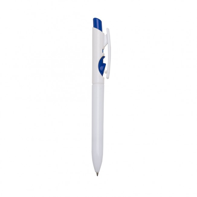 Caneta plástica com carga esferográfica azul e acionamento por clique.