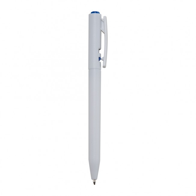 Caneta plástica com carga esferográfica azul e acionamento por clique.