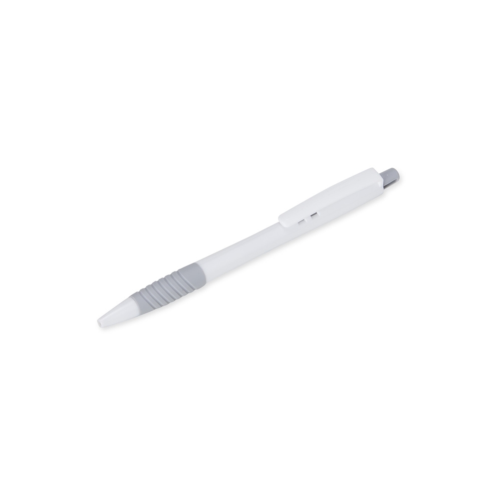 Caneta plástica com detalhe emborrachado e acionamento por clique, carga esferográfica azul 0.8mm.