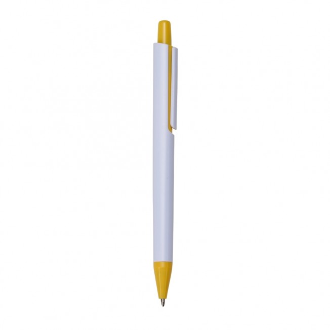 Caneta plástica com carga esferográfica azul e acionamento por clique.