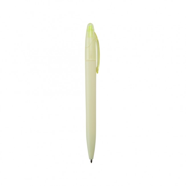 Caneta plástica com marca texto com tampa protetora para o marca texto, carga esferográfica azul 1.0mm e acionamento por rotação.
