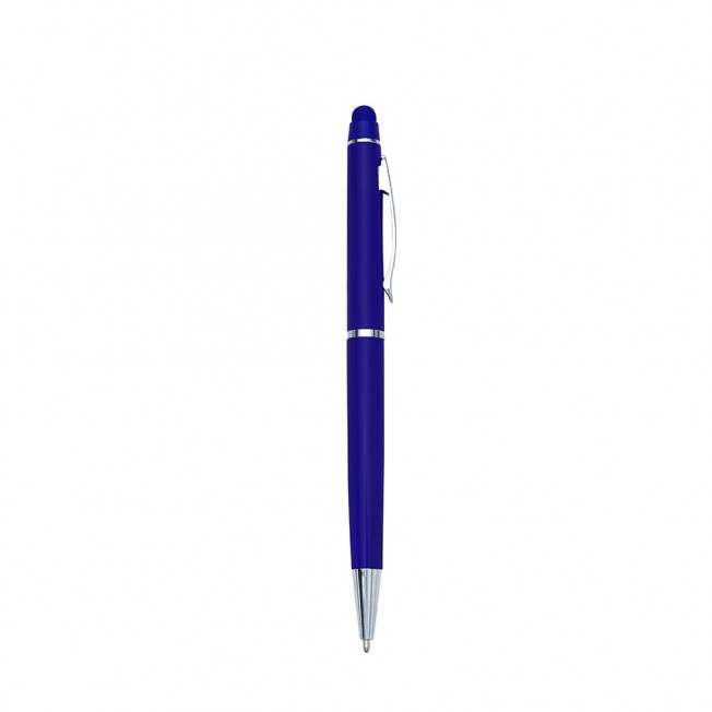 Caneta semimetálica com touch screen, carga esferográfica azul e acionamento por rotação.
