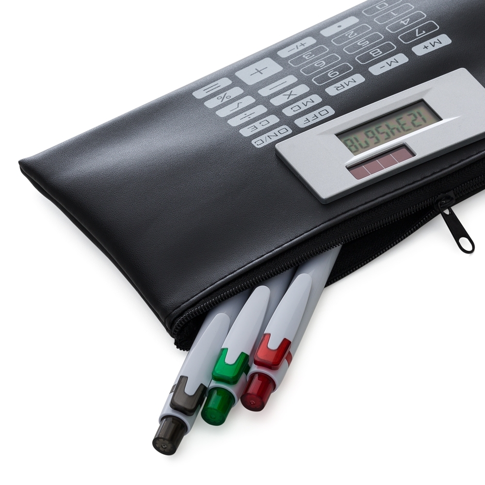 Carteira couro sintético com calculadora solar de 8 dígitos. Carteira preta com detalhes prata na calculadora e botões impressos na capa em branco, possui zíper.