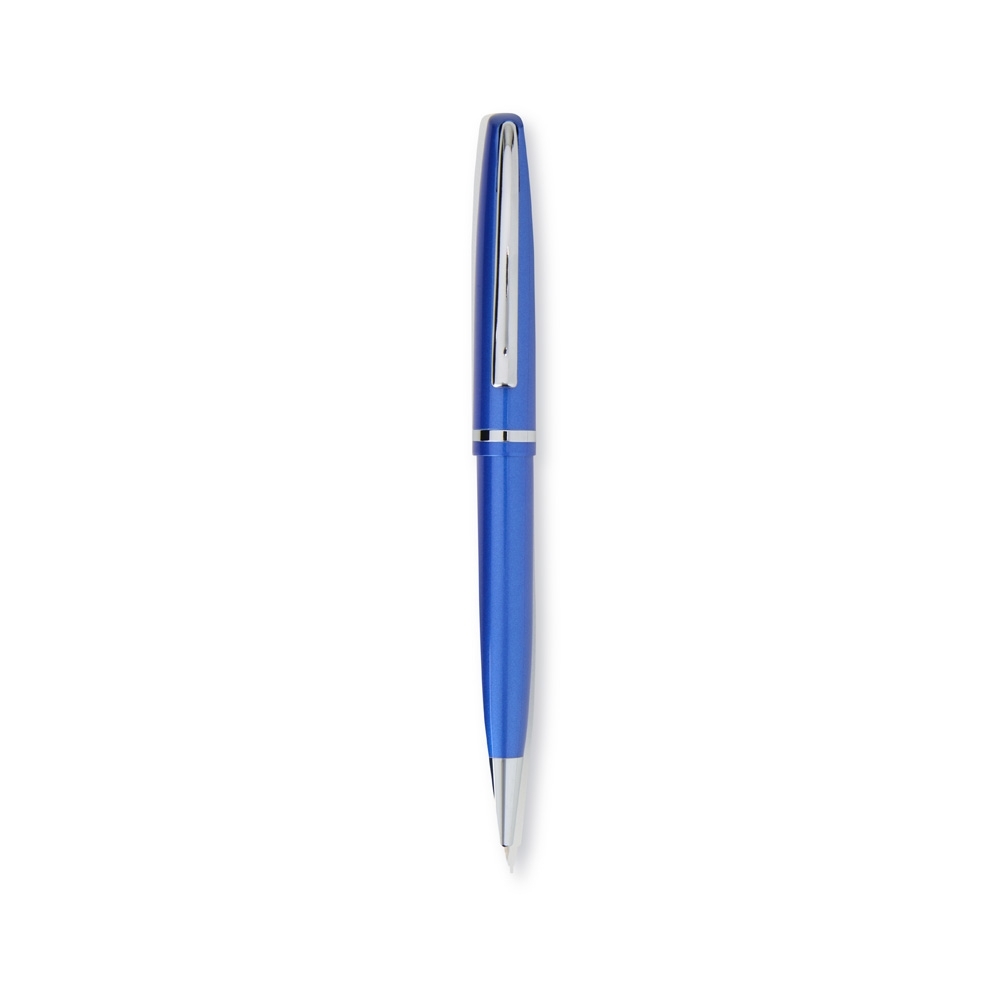 Conjunto de caneta e lapiseira metálicas em estojo metal. Caneta e lapiseira possuem acabamento brilhante, carga esferográfica azul de 1.0mm e acionamento por rotação.