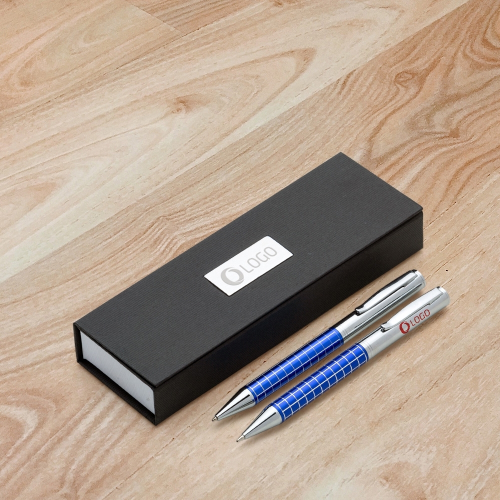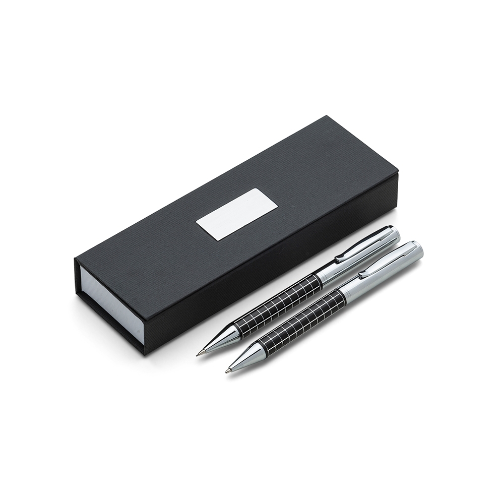Kit caneta e lapiseira de metal em estojo papelão com placa de metal(parte interna do estojo revestida com espuma). Caneta e lapiseira prata com detalhes coloridos e quadriculados, clip metal com anel superior na ponta e dois anéis centrais e acionam por giro.