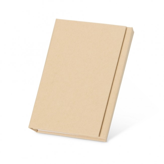 Bloco de Anotações Ecológico, material em kraft. Possui notas autoadesivas, aproximadamente 25 folhas, bloco autoadesivo amarelo com aproximadamente 25 folhas, compartimento para guardar anotações, uma régua em material plástico de 12 cm, caneta de papelão e bloco grande com aproximadamente 100 folhas.