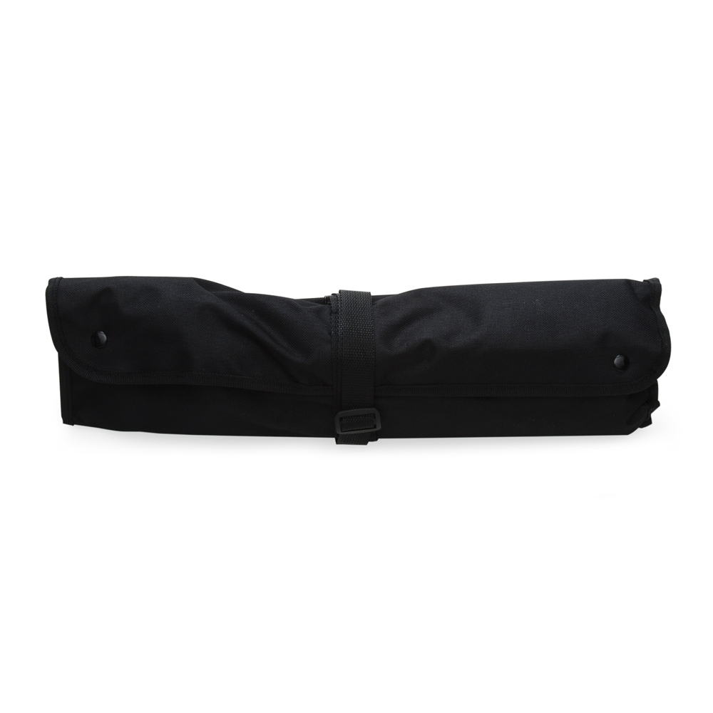 Kit churrasco 8 peças em estojo de nylon. Contém espátula, garfo, faca, pegador, saleiro, paliteiro, luva e avental (também utilizado como estojo). Talheres de inox com acabamento de madeira e avental de nylon com alça ajustável – possui botão e alça com fivela para lacre.
