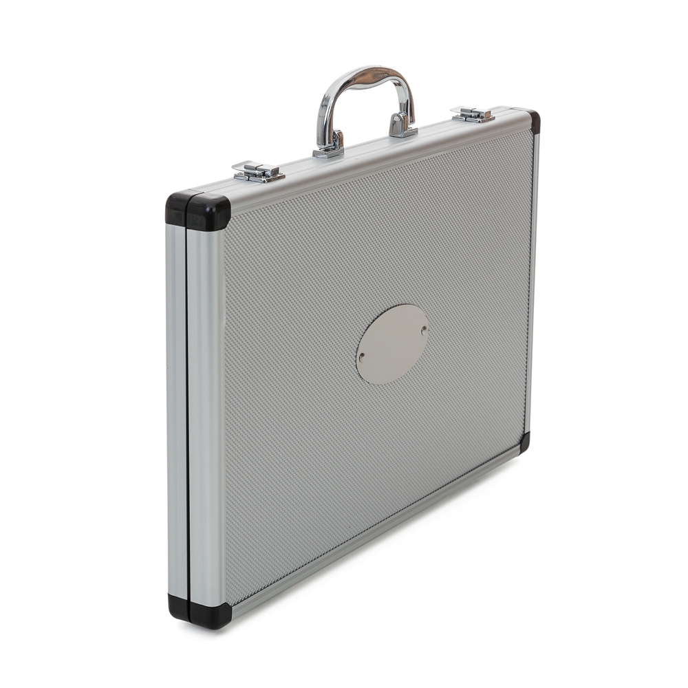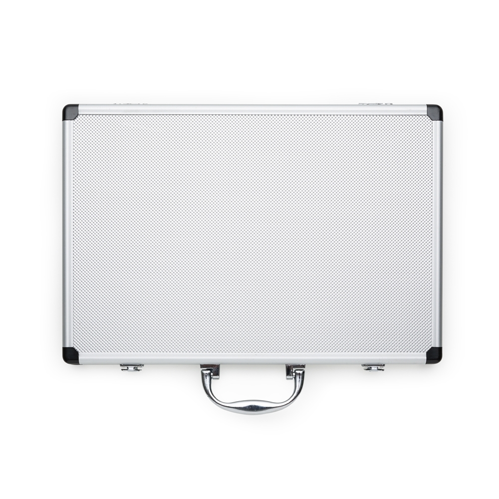 Kit Facas 5 peças em maleta de alumínio texturizado com placa central para personalização. Possui cinco facas(com proteção plástica) inteiras inox em tamanhos diferentes, parte interna da maleta revestida com veludo e possui também elásticos para fixar as peças. Parte externa da maleta possui uma alça e bordas plásticas pretas, duas dobradiças inferiores e parte superior com duas travas.