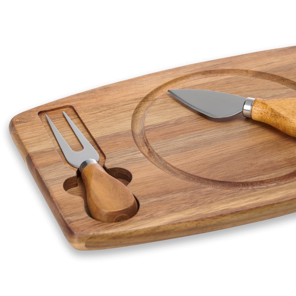 Kit queijo 3 peças, contém: tábua de madeira com canaleta, faca com ponta, e garfo. Tábua com imã para encaixe e fixação dos utensílios.
