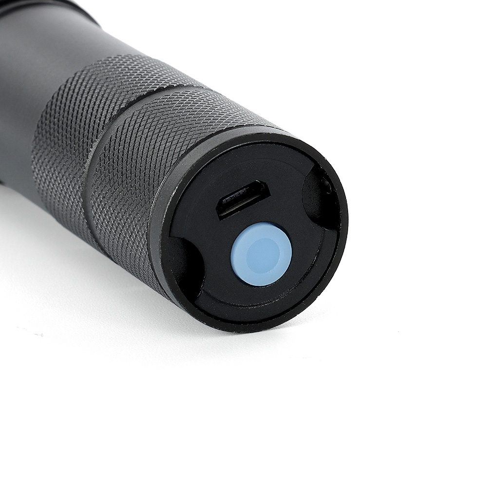 Lanterna led recarregável com zoom de regulagem e três estágios de iluminação, material metálico. Acompanha cordão de nylon e cabo USB-V8.
