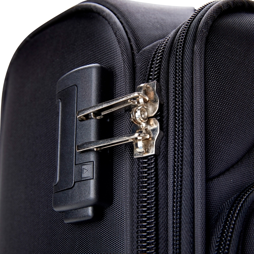 Mala de bordo 47 Litros com padrão ANAC (Agência Nacional de Aviação Civil), confeccionada em poliéster de alta qualidade, com cadeado numérico TSA. Possui etiquetas de identificação embutidas na mala, sendo uma integrada ao cadeado e outra na parte de trás da mala, acoplada por estojo em couro sintético. Três compartimentos, bolso telado, cinta compressora para roupas, alça de mão em poliéster, puxador retrátil com regulagem de tamanho e quatro rodinhas 360º.
