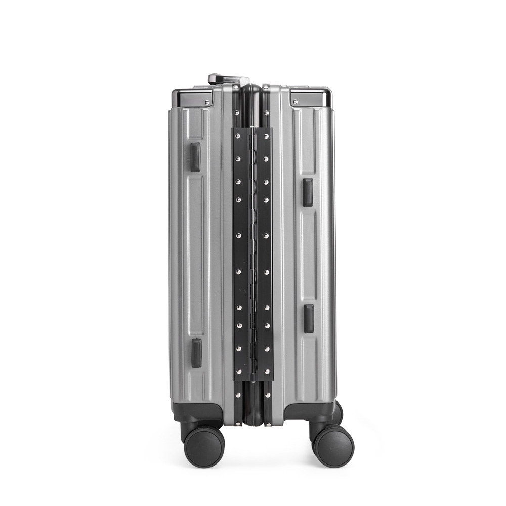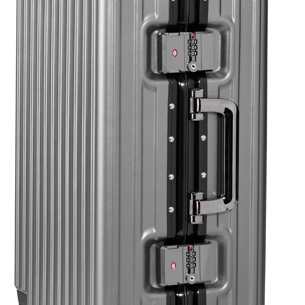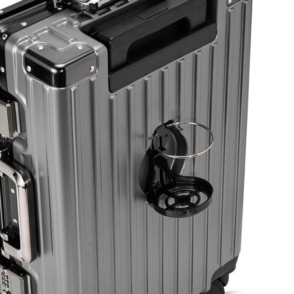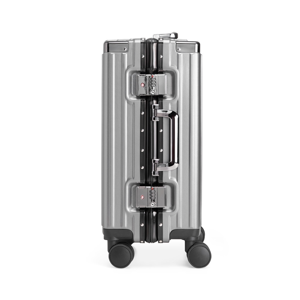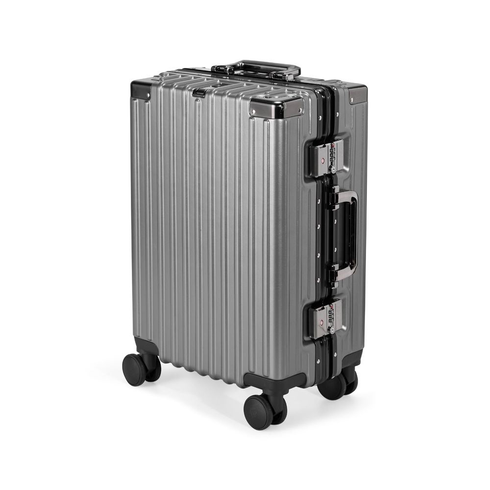 Mala de viagem 46 litros feita em plástico com acabamento em alumínio, contém cadeado numérico TSA. Compartimentos internos com bolso telado, bolso plástico para itens molhados e cinta compressora para roupas. A mala possui duas alças de mãos, puxador retrátil com regulagem de tamanho e suporte para celular, suporte porta bolsa, suporte para copo ou garrafa, quatro rodinhas 360º e apoios laterais.