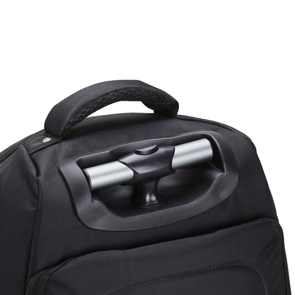 Mochila 27 litros com rodinhas e cadeado TSA. Possui padrão para bagagem de mão, conforme especificações ANAC (Agência Nacional de Aviação Civil) Confeccionada em nylon, contém alça revestida com espuma para um maior conforto, puxador retrátil com regulagem e botão acionador, alças para as costas escondidas no compartimento traseiro com zíper. Com 5 compartimentos, sendo um pequeno para carteira e canetas, dois medianos para documentos, bolsos nas laterais, bolso para notebook até 15,6 polegadas com divisórias para celular e forro com zíper. Possui duas rodinhas e freio em plástico, além de um sistema velcro para junção do compartimento das alças com a parte inferior, tampando as rodinhas enquanto transporta a mochila nas costas.