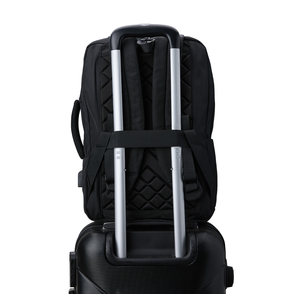 Mochila confeccionada em Nylon, 21 litros, com 4 compartimentos, sendo o principal com bolso para notebook de 15.6 polegadas. Possui dois bolsos externos, bolsos e divisórias internas para acessórios. A mochila possui suporte externo USB, alça com bolso integrado para cartões, alça para engate em malas de viagem e duas alças de mão, sendo uma delas para o transporte da mochila no formato pasta.