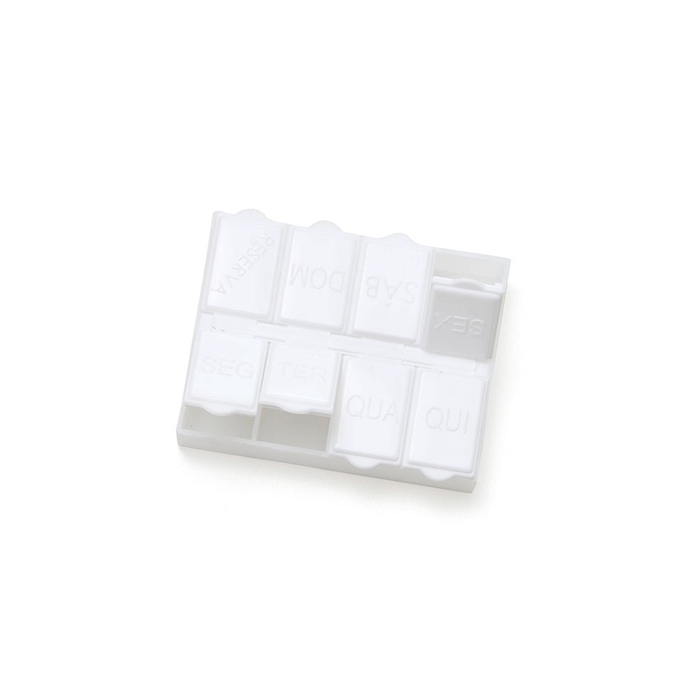 Porta comprimidos semanal de plástico branco fosco. Possui oito divisórias, sete delas escrito em relevo os dias da semana e a última escrito “reserva”. Verso liso. OBS.: PEDIDO MÍNIMO DE 50 PEÇAS!