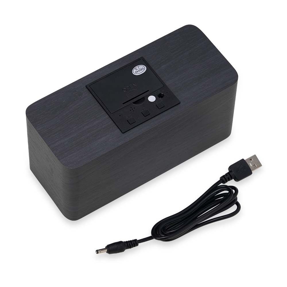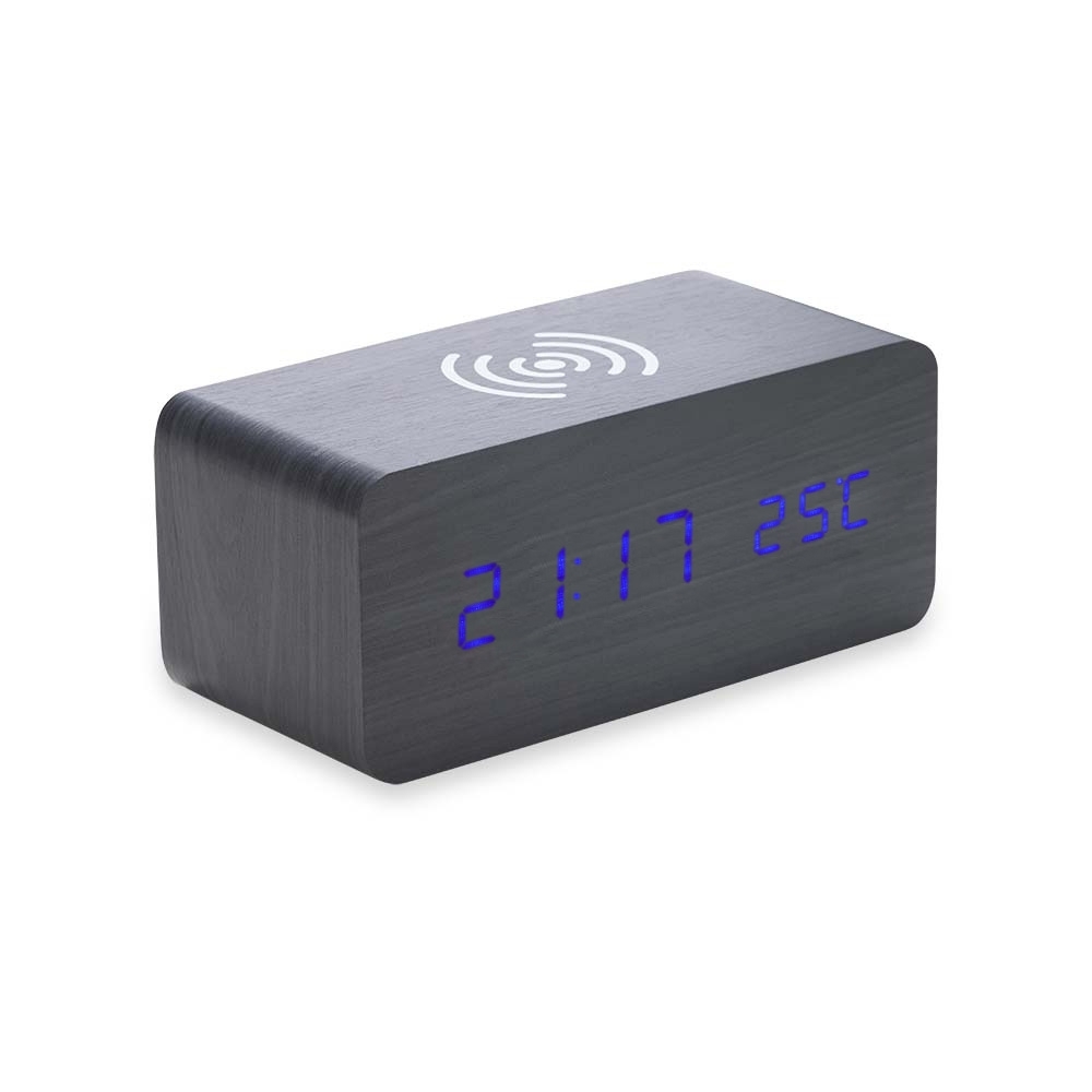 Relógio digital LED com alarme e carregamento por indução, pode ser utilizado através da fonte USB (acompanha) ou 3 pilhas AAA (não acompanha). Produzido em MDF, o relógio possui um display LED na parte frontal, área para carregamento via indução na parte superior, parte traseira com mecanismo para ajustes, entrada DC 5V e compartimento de pilhas.