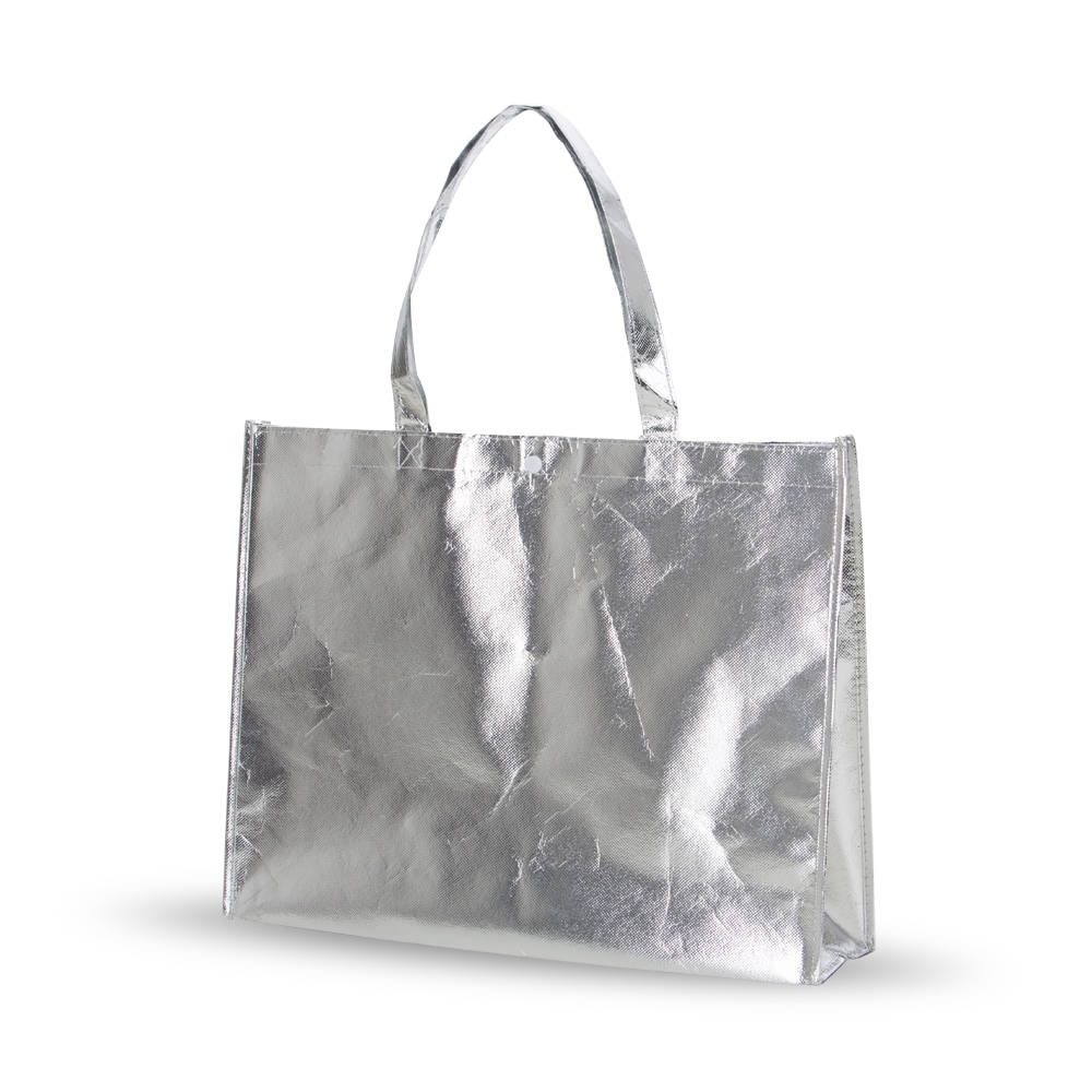 Sacola TNT metalizada com botão. Confeccionado em TNT com revestimento plástico laminado, parte superior possui botão plástico para fecho.