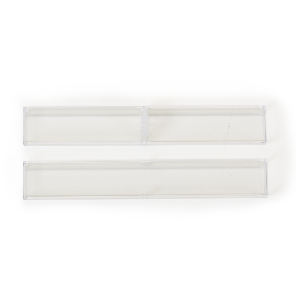 Tubo de acrílico retangular, há uma espécie de “anel” central emborrachado para sustentar/encaixar a caneta. OBS.: PEDIDO APENAS MÚLTIPLO DE 50 PEÇAS!